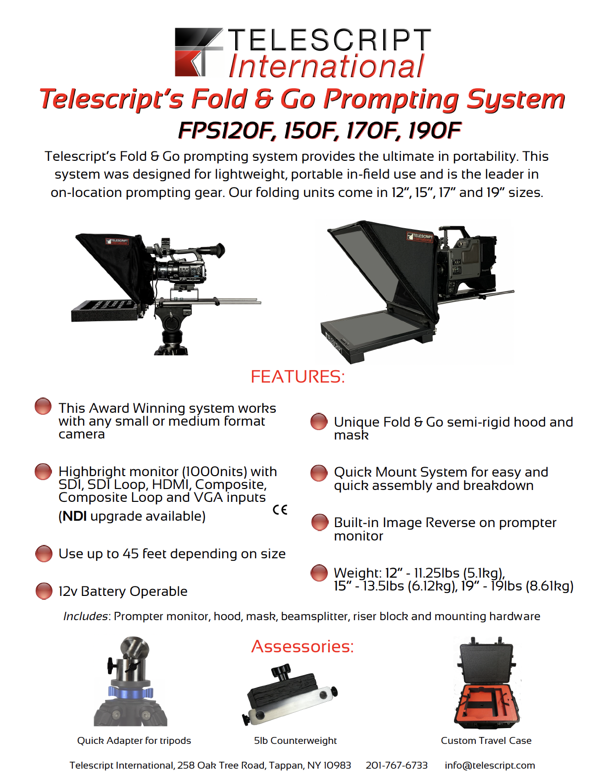 TelescriptのOn-Locationシリーズは、現場での設営・撤収・移動を前提に開発された、オンロケ向けプロンプティング機材の定番モデルです。FPS-190F-NDIは、持ち運びやすさと放送品質の可読性を両立し、イベント配信や出張撮影など、スピードと安定運用が求められる現場に適しています。