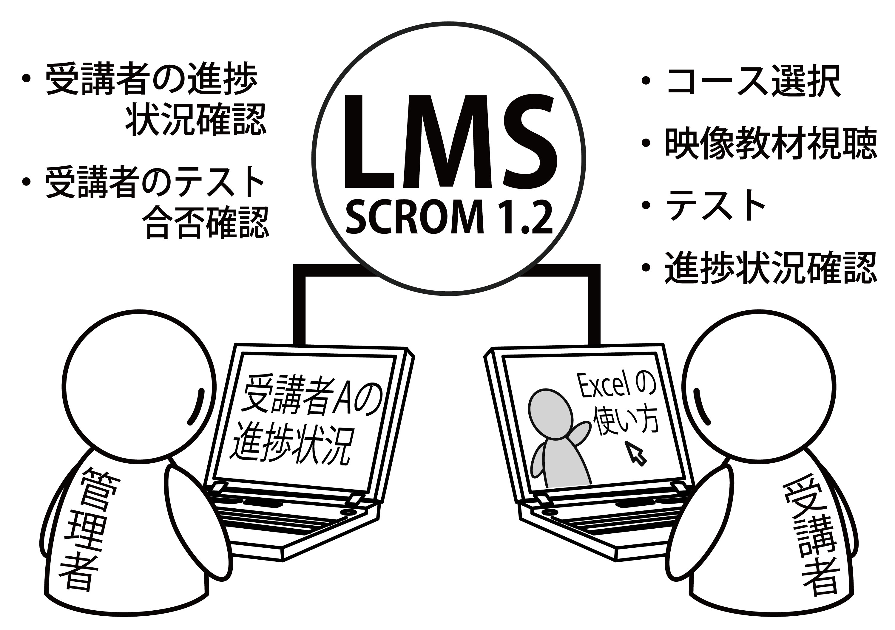 SCORM規格が普及すれば、利用者側は多くのコンテンツベンダーの教材を自分のLMSで使用することができ、逆にコンテンツベンダーにとっては、自社のコンテンツが他のベンダーのプラットフォームでも使えるようになるため、コストをかけずにコンテンツの販路を拡大することが可能になる。このように標準化は、低コストで高品質なeラーニングサービスの実現に必須の要素となっている。 - LMS(Learning Management System)