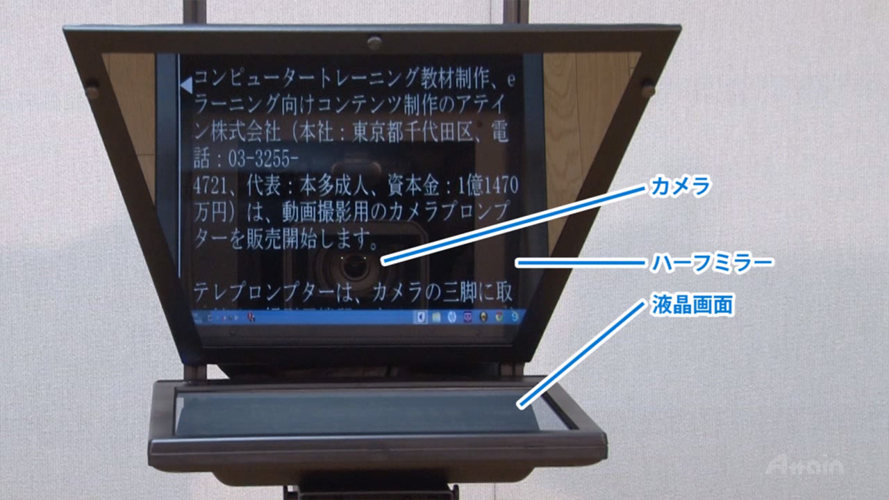 カメラレンズの前にハーフミラーを取り付け、ハーフミラーに投影した原稿を読むことで、出演者のカメラ目線を維持することができます。