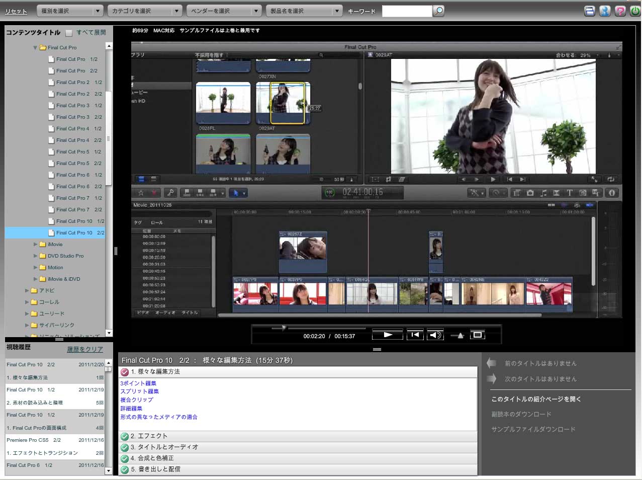 今回提供開始する「映像制作をはじめようFinal Cut Pro X」は、Final Cut Pro Xに関する基礎的な部分の解説から応用まで網羅した、充実した内容の教材です。内容は、基本・応用・追加機能の3つのセクションにわかれています。基本ではFinal Cut Pro Ⅹの画面構成や、素材の読み込み、新規プロジェクトの作成、ビデオ編集の基本を学習。応用では、映像作品をより印象的にするエフェクトや、合成の方法、作成したビデオの出力や、Webへの公開方法などより実践的な学習を行います。すでに「Final Cut Pro」をお使いで、新しいバージョンの操作になれたいという方にも最適な教材です。