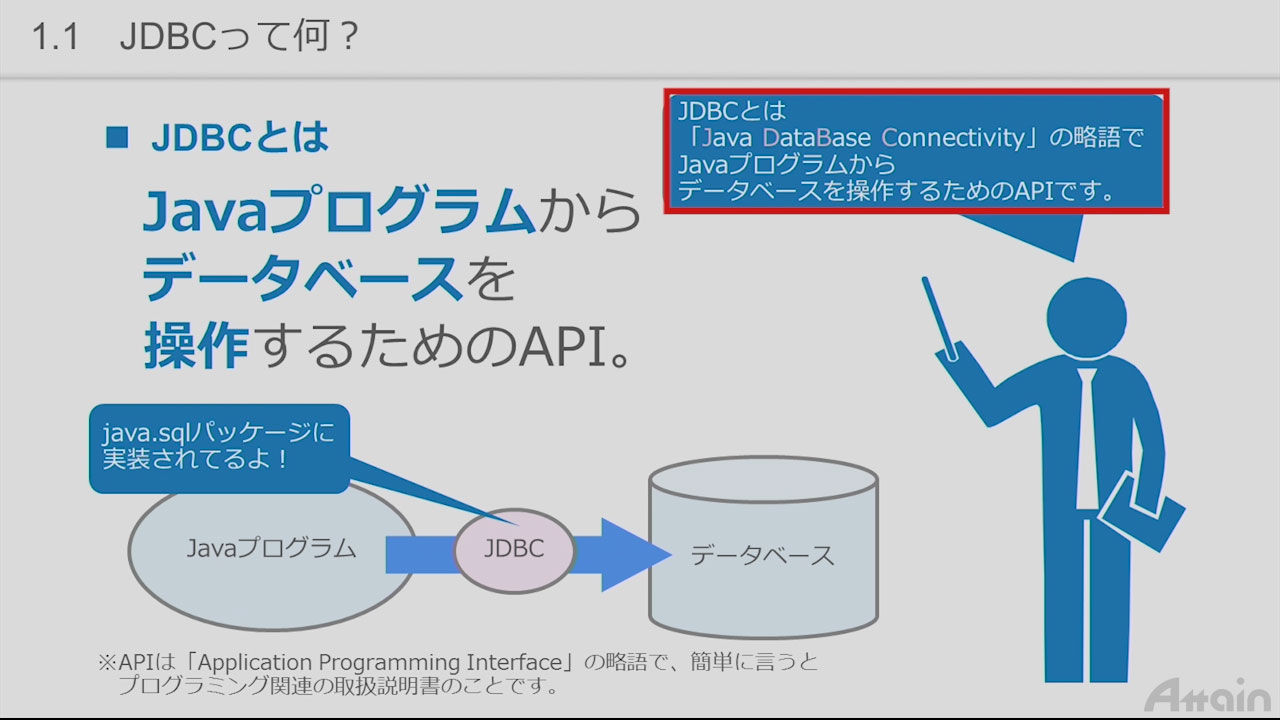 コンピュータートレーニング教材制作、eラーニング向けコンテンツ制作のアテイン株式会社(本社:東京都江東区、電話:03-6381-8641、代表:本多成人、資本金:1億1470万円)は、月額2,800円(税込)で様々な動画講座が視聴し放題のクラウドeラーニングサービス「動学.tv(https://www.attainj.co.jp/dougaku.tv/)」に、プログラミング言語JavaでのDBアクセスが学べる「誰でもわかる Java DBアクセス基礎」講座を、8月3日に公開します。
