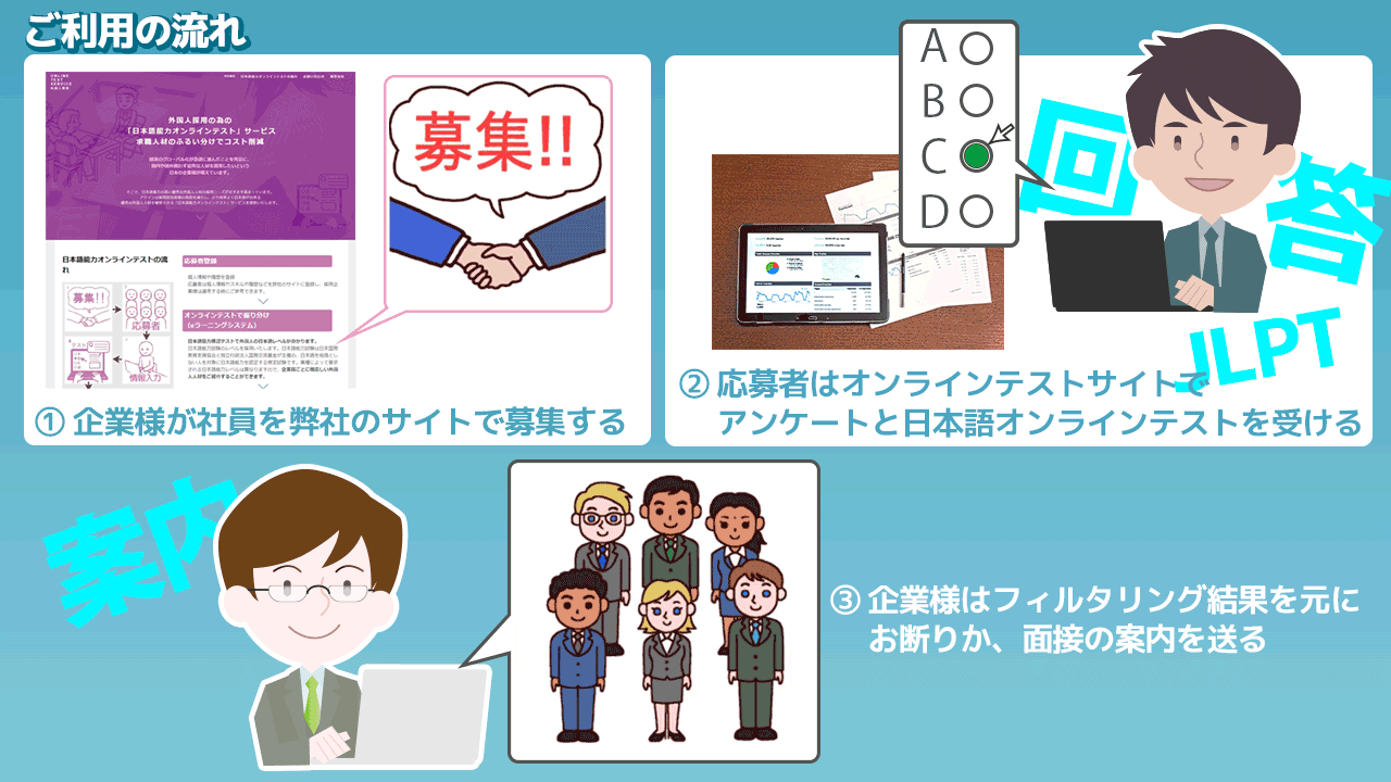 ・オンラインテスト対面テストサービス「外国人社員応募者への日本語レベルテスト」の流れ