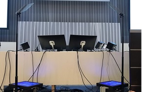 スピーチプロンプターは、原稿テキストを投影する演説用機材です。ハーフミラーにテキストを投影させることで、演説者は聴衆に目を向けながら、原稿を読むことができます。モニターは床に置き、専用のソフトウェアを使って、画面に原稿を表示、スクロールすることができます。観客からは、投影された原稿は見えません。