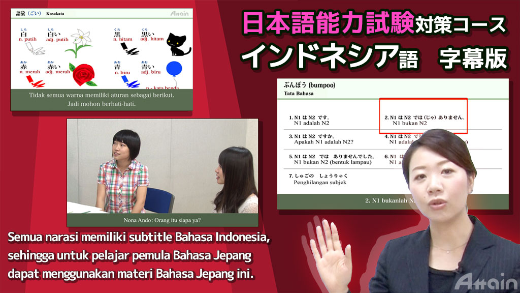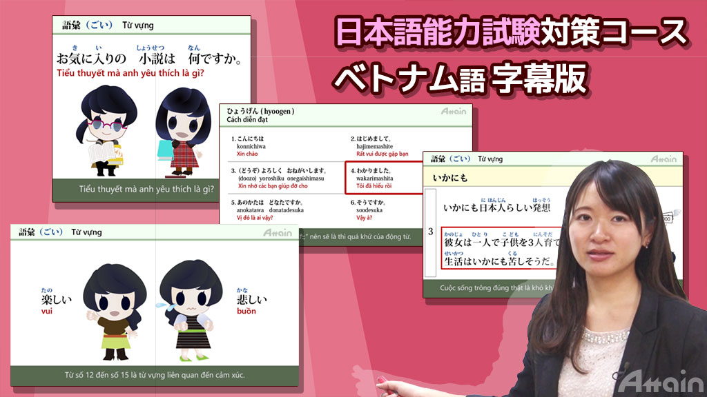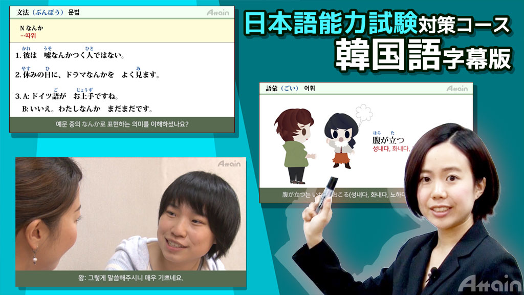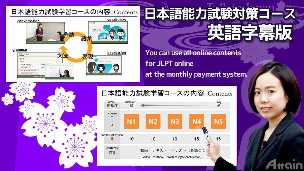 「Attain Online Japanese」(アテイン・オンライン・ジャパニーズ)は『日本語能力試験学習コース』(入門編・漢字編・JLPT N1-JLPTN5)全コースが視聴見放題の日本語学習サイトとなります。月々わずか980円(税別)でこれら全ての講座を何度でも視聴可能なサービスです。高速ブロードバンド回線によるオンデマンド配信なので時間や場所に拘束されず、操作も簡単なので目的の講座を探し出してすぐに学習を始めることが可能です。
