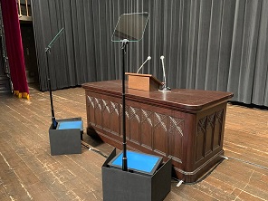 2台のスピーチプロンプターにスクロール原稿を映します。さらに議長に向けたメッセージを別PCから小画面表示しておくこともできます(野次対応、質疑応答時)。そしてスピーチプロンプターに表示している画面を取締役席や監査席でモニターすることができます。