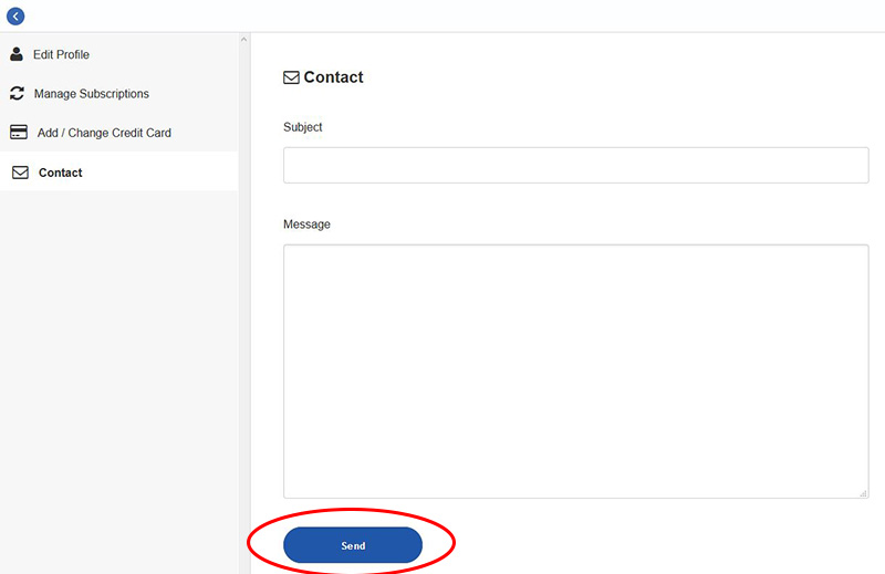 Enter the content into “Subject” and “Message” on the “Contact” page.[Contact]ページで[Subject](①)と[Message](②)に内容を入力します。