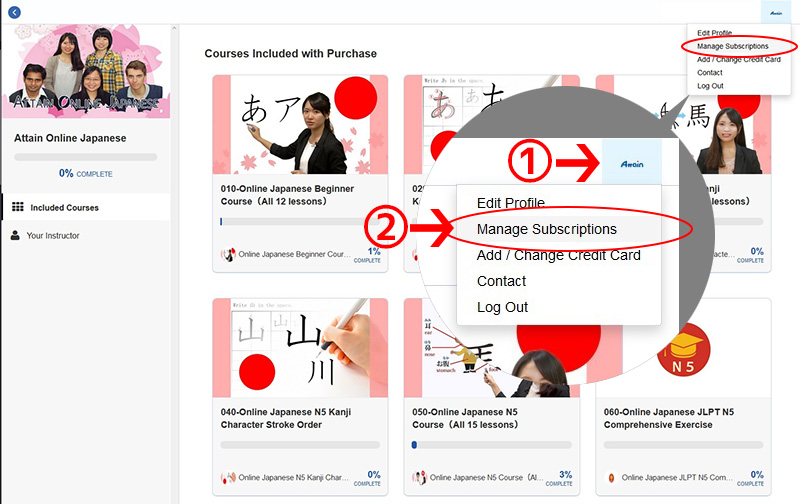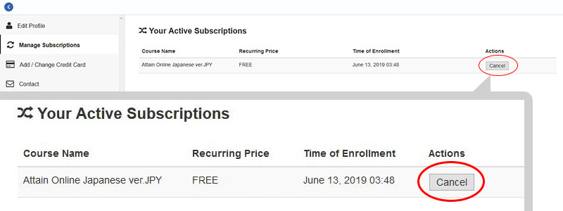 Click “Cancel” button in “Actions”, then your monthly subscription ends. ※The videos cannot be watched any more after the end of your purchased current plan.