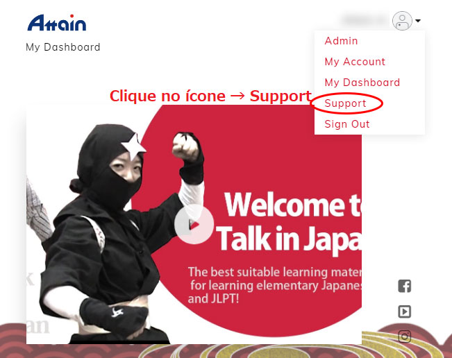 1 Após o login, clique no ícone no canto superior direito e selecione "Suporte".