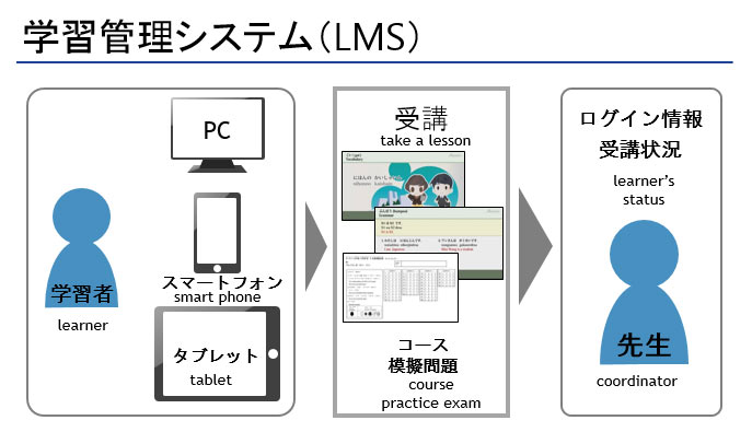 The administration tool can be used on not only PCs, but also iPhone/iPad and Android devices. This enables the users to check the learning states and quiz results anywhere.