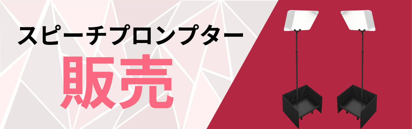 スピーチプロンプターは、原稿テキストを投影する演説用機材です。プロンプターの下部には液晶画面があり、液晶画面にはPC上に表示させた原稿を映すことができます。液晶画面の原稿を、ハーフミラーに反映させることによって、演説者は聴衆に目を向けながら、顔をしっかりとあげて、原稿を読むことが可能になります。ハーフミラーは特殊なコーティングがされたガラスで、聴衆側からはミラーに映った原稿は見えません。株主総会、決算報告会、政治家の会見、講演、セミナー、入社式など社内行事、さまざまな式典、などで多く利用されています。